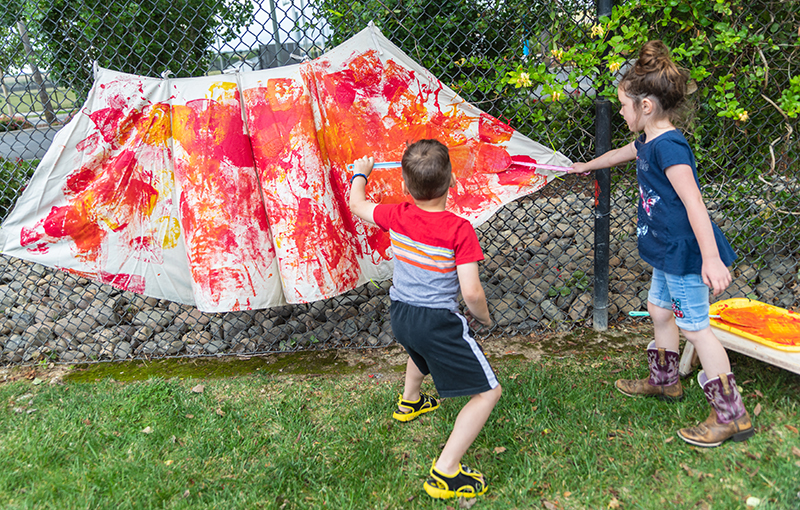 Water Painting: With a small container and an old paintbrush, give your child some water to paint outside on cement and wooden fencing. The water will create a darker shade, then evaporate. If you have extra pans and rollers from a painting project, have your child use these as well, experimenting with different sizes and shapes. Spray bottles also are a big hit for water painting or watering the foliage in your yard.